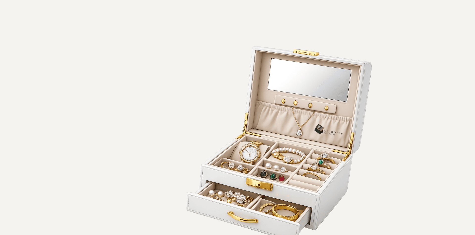 Chaque boîte à bijoux est méticuleusement conçue avec des compartiments spécialisés pour vos bagues, boucles d’oreilles, colliers et bracelets, permettant un rangement optimal et un accès facile à vos pièces préférées