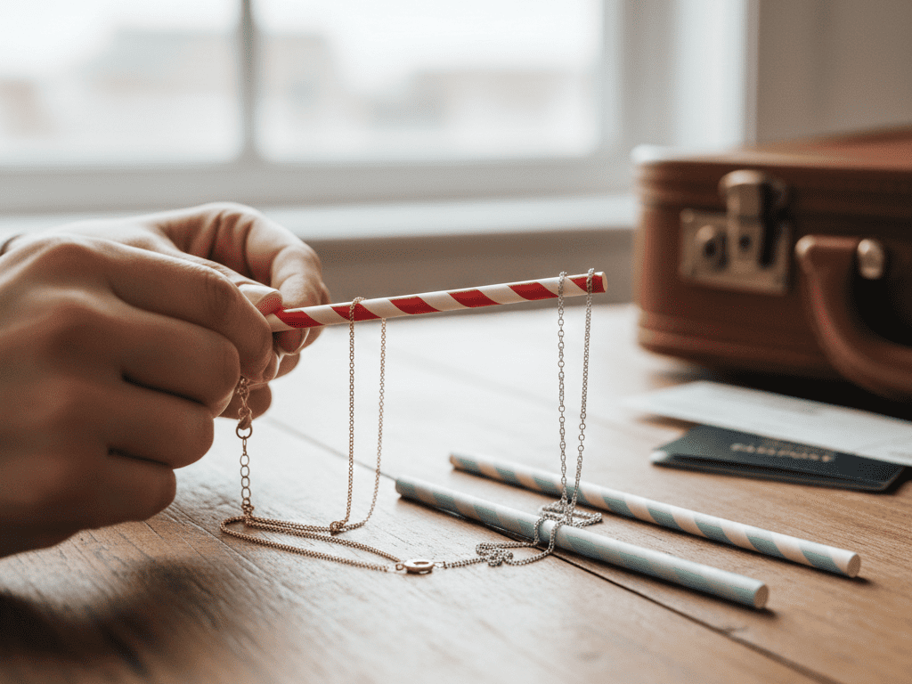 - Pourquoi ça marche : La paille maintient la chaîne tendue, l’empêchant de s’entortiller sur elle-même ou avec d’autres bijoux.